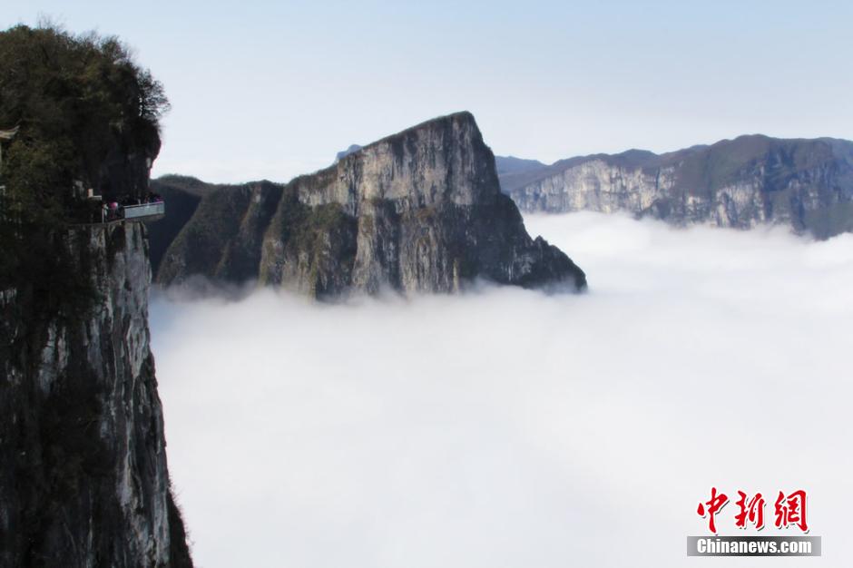 A sea of clouds appears at Tianmen mountain at Zhangjiajie, central China's Hunan province on March 30, 2015. Tourists can even see the light of Buddha under the glass plank road. (CNS/Ding Yunjuan)