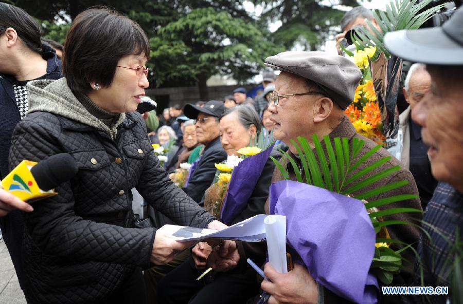 Tamaki Matsuoka (L), head of the Japan-China Peace Research Organization, talks with survivors of Nanjing Massacre in a ceremony to mourn the Nanjing Massacre victims at the Memorial Hall of the Victims in Nanjing Massacre by Japanese Invaders on the Qingming Festival in Nanjing, capital of east China's Jiangsu Province, April 5, 2015. Japanese troops captured Nanjing, then China's capital, on Dec. 13 of 1937 and started a 40-odd-day slaughter. More than 300,000 Chinese soldiers who had laid down their arms and civilians were murdered, and over 20,000 women were raped. (Xinhua/Han Yuqing)