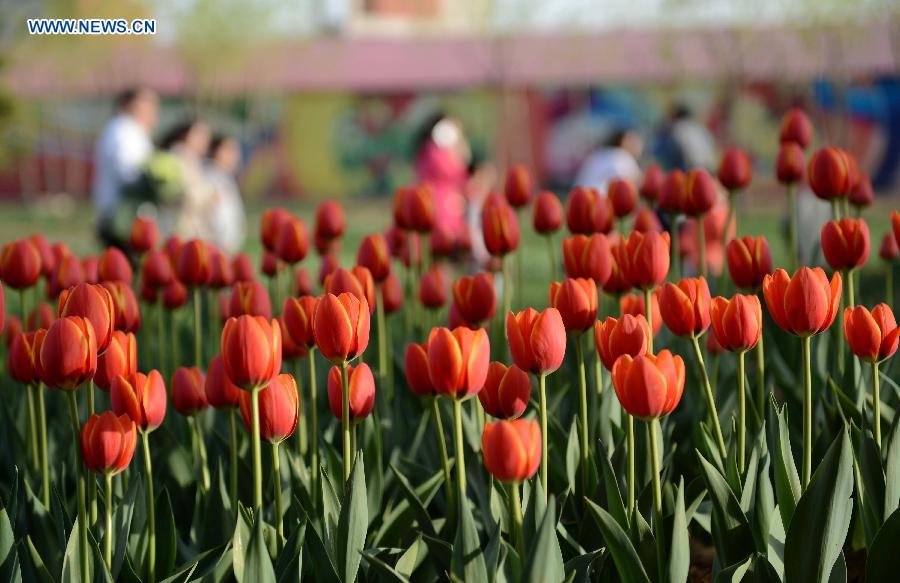 Citizens view the blooming tulips at Shijiazhuang botanical garden in Shijiazhuang, capital of north China's Hebei Province, April 6, 2015. The tulips here attracted many tourists to the garden during the three-day holiday of Qingming Festival, or Tomb-sweeping Day. (Xinhua/Wang Xiao)