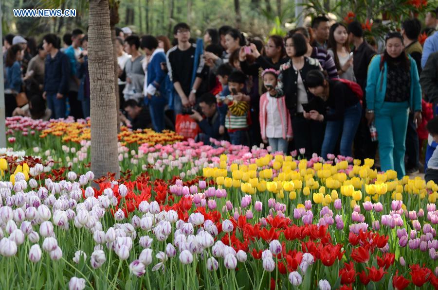 Citizens view the blooming tulips at Shijiazhuang botanical garden in Shijiazhuang, capital of north China's Hebei Province, April 6, 2015. The tulips here attracted many tourists to the garden during the three-day holiday of Qingming Festival, or Tomb-sweeping Day. (Xinhua/Wang Xiao)