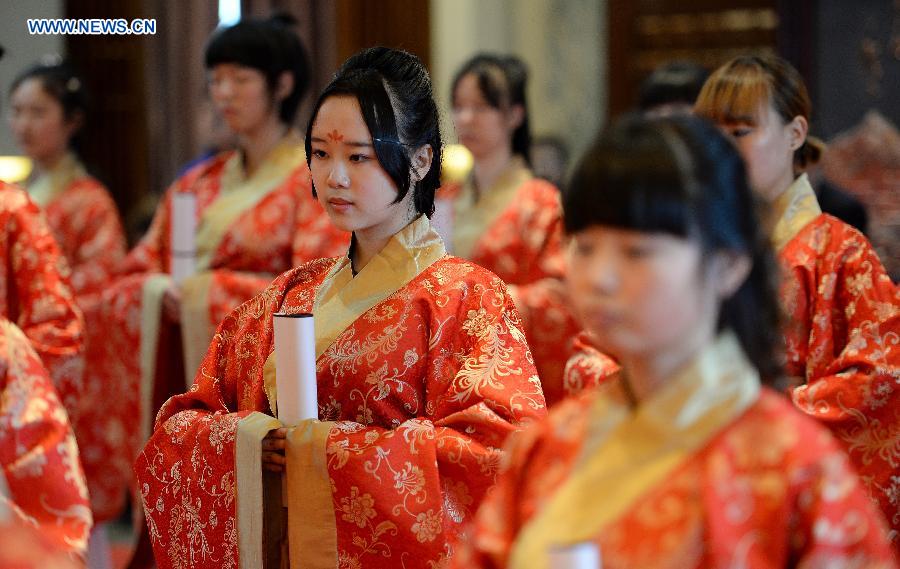 Girls take part in a female adulthood ceremony in Hancheng Lake in Xi'an City, capital of northwest China's Shaanxi Province, April 6, 2015. More than 30 girls observed the tradition of the Han people to enter their adulthood during the ceremony. (Xinhua/Liu Xiao)