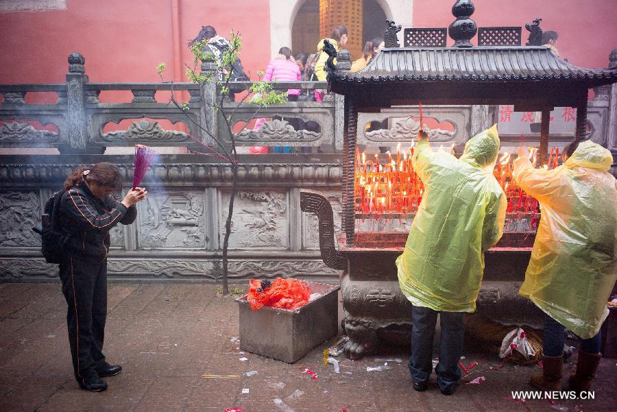 | Tourists burn incenses on the birthday of Bodhisattva Guanyin at Qiyuan Temple on Jiuhua Mountain, east China's Anhui Province, April 7, 2015. Jiuhua Mountain, one of the four sacred mountains of Chinese Buddhism, ususally hold various Buddhist rituals and events on the birthday of Bodhisattva Guanyin, which falls on the 19th day of the second month in the lunar calender. (Xinhua/Guo Chen) |