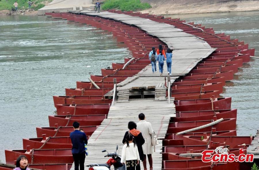 Pedestrians walk on a pontoon bridge in Qianshan county, East China's Jiangxi province, April 6, 2015. The 187-meter-long bridge, firstly built in 1908 of Qing Dynasty, uses 42 boats, linked with iron chains, to support a continuous deck. (Photo: China News Service/Zhuo Zhongwei)