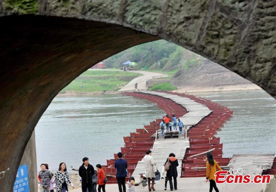 Pedestrians walk on a pontoon bridge in Qianshan county, East China's Jiangxi province, April 6, 2015. The 187-meter-long bridge, firstly built in 1908 of Qing Dynasty, uses 42 boats, linked with iron chains, to support a continuous deck. (Photo: China News Service/Zhuo Zhongwei)