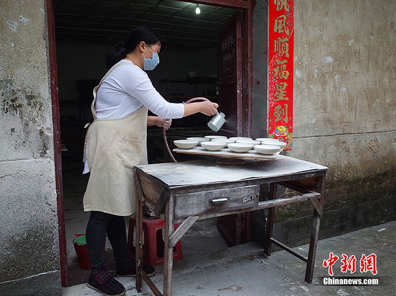 After the ceramic paste dries out, a worker sprays glaze on the ceramic paste. (CNS/Li Qing)