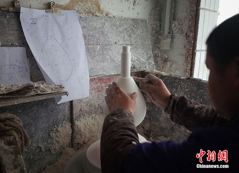 A worker makes a mold according to the drawing of a ceramic vase. (CNS/Li Qing)