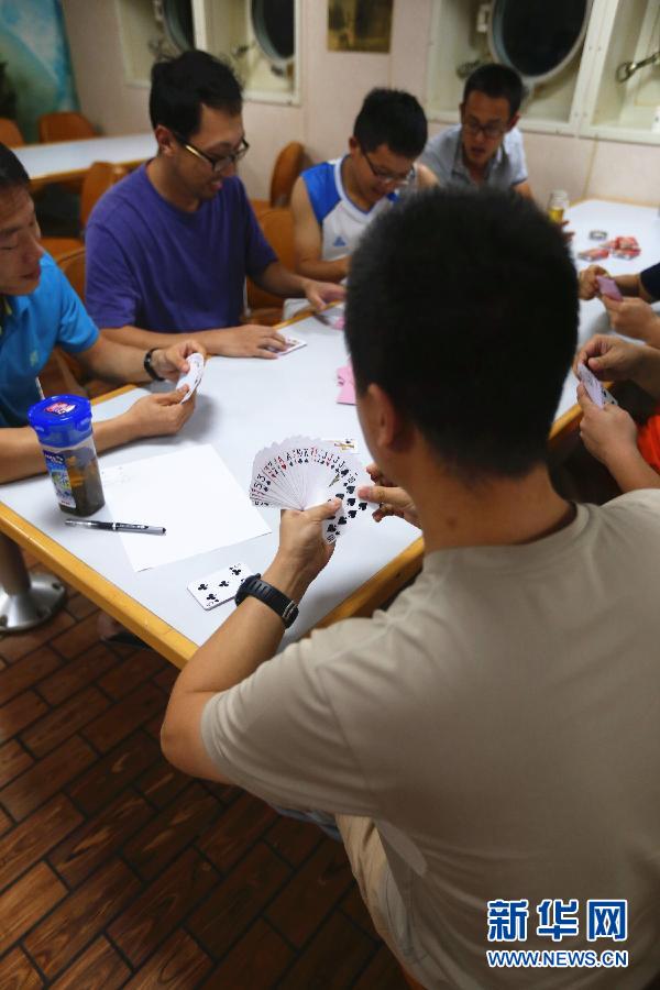 Photo taken on March 28, 2015 shows crew members playing cards on Xuelong. (Photo/Xinhua)