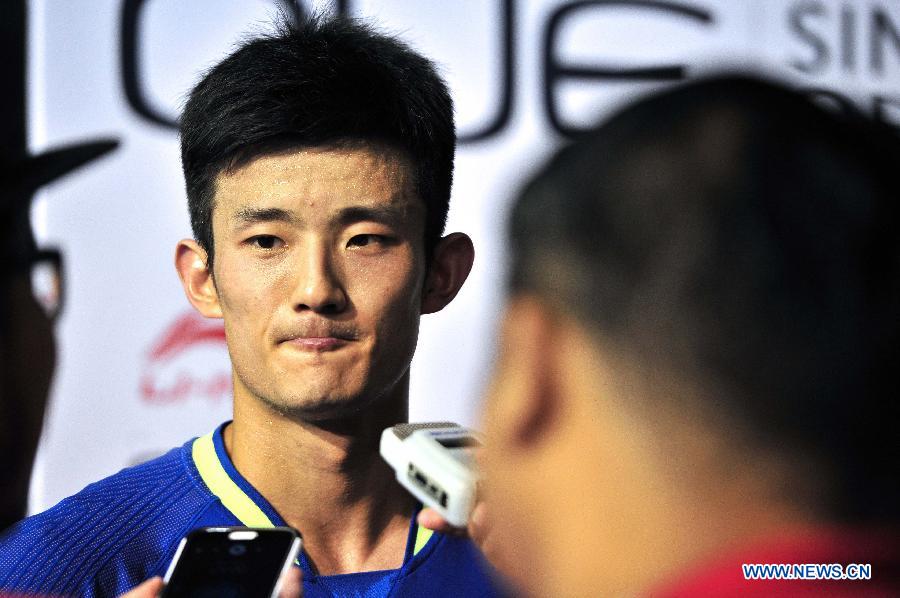 Chen Long of China attends an interview after the men's singles second round match of the OUE Singapore Open against Hu Yun of China's Hong Kong in Singapore, April 9, 2015. Hu Yun won 2-1. (Xinhua/Then Chih Wey)