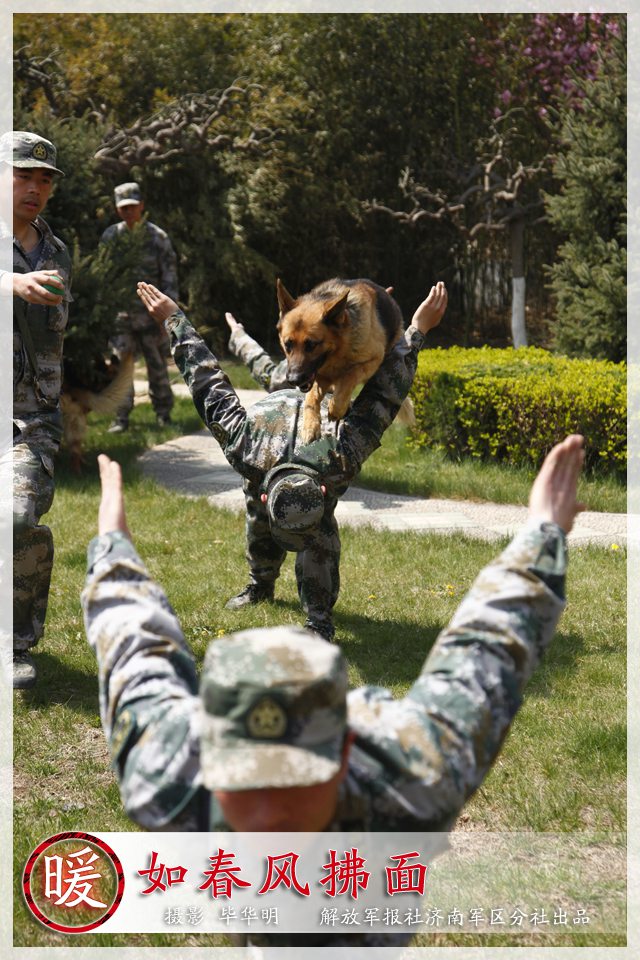 Soldiers from Jinan Military Region train their dogs to surmount obstacles, go through fire circles, cross bridges and catch things rapidly. Those dogs are trained to sit, lie down, stand, walk and bite. (Chinamil.com.cn/Bi Huaming)