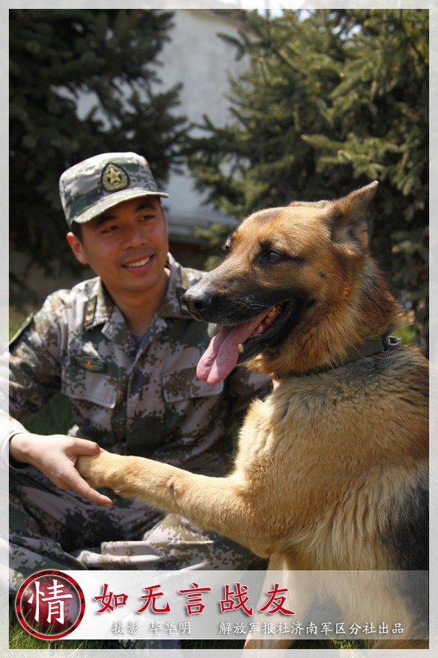 | Soldiers from Jinan Military Region train their dogs to surmount obstacles, go through fire circles, cross bridges and catch things rapidly. Those dogs are trained to sit, lie down, stand, walk and bite. (Chinamil.com.cn/Bi Huaming) |
