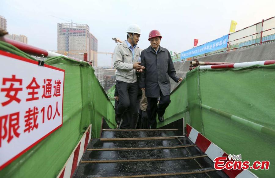Premier Li Keqiang (R) talks with a worker at the construction site of a transportation hub in Changchun, the capital of Northeast China’s Jilin province, April 9, 2015. Li emphasized the important role of investment in driving up the economy. (Photo: China News Service/Liu Zhen)
