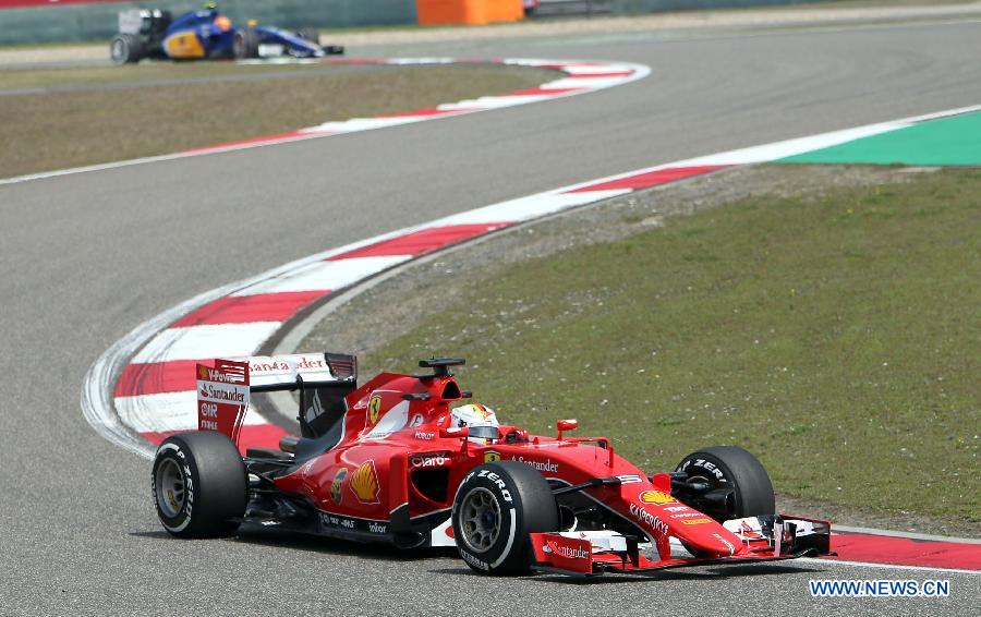 Ferrari's German driver Sebastian Vettel drives his car during the first practice session of the Formula One Chinese Grand Prix in Shanghai, east China, April 10, 2015. (Xinhua/Fan Jun)