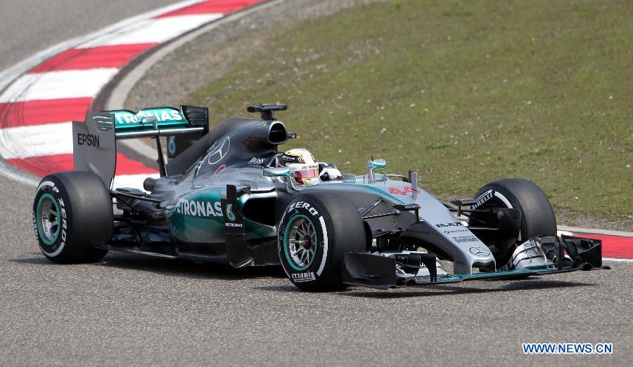 Mercedes AMG Petronas F1 Team's British driver Lewis Hamilton drives his car during the first practice session of the Formula One Chinese Grand Prix in Shanghai, east China, April 10, 2015. (Xinhua/Fan Jun)