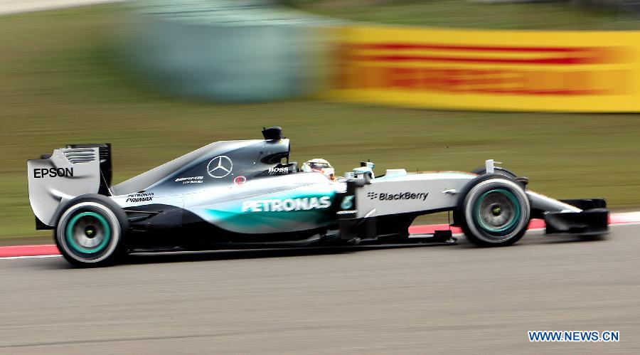 Mercedes AMG Petronas F1 Team's British driver Lewis Hamilton drives his car during the first practice session of the Formula One Chinese Grand Prix in Shanghai, east China, April 10, 2015. (Xinhua/Fan Jun)