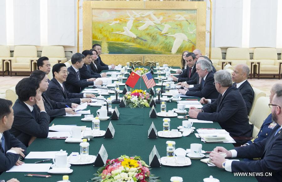 | Chinese State Councilor and Public Security Minister Guo Shengkun (4th L) and U.S. Secretary of Homeland Security Jeh Johnson co-chair the first ministerial meeting between the Chinese Ministry of Public Security and the U.S. Homeland Security Department in Beijing, China, April 9, 2015. (Xinhua/Wang Ye) |
