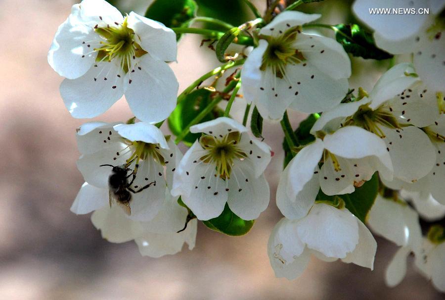 A bee lands on blooming pear flowers in Dunhuang City, northwest China's Gansu Province, April 13, 2015. (Xinhua/Zhang Xiaoliang)