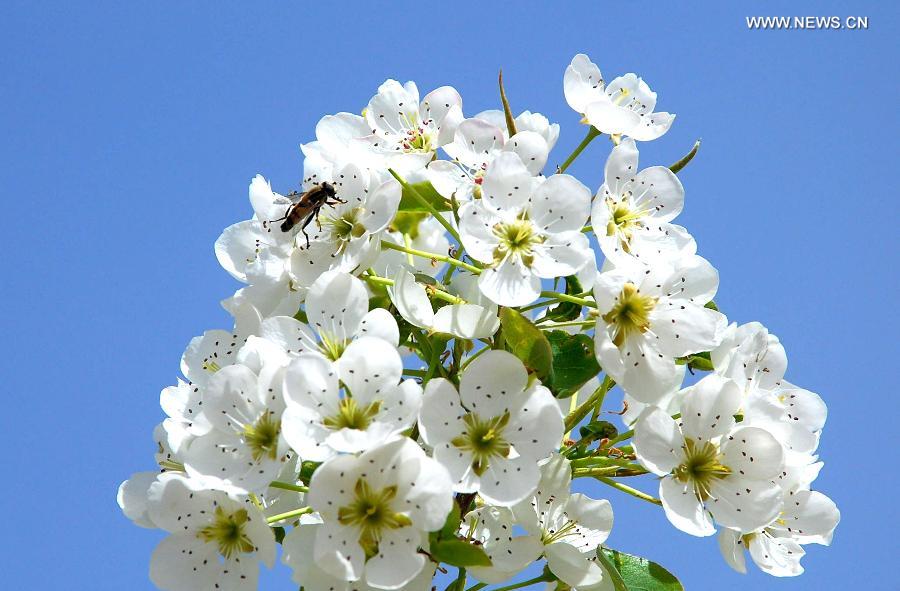 A bee lands on blooming pear flowers in Dunhuang City, northwest China's Gansu Province, April 13, 2015. (Xinhua/Zhang Xiaoliang)