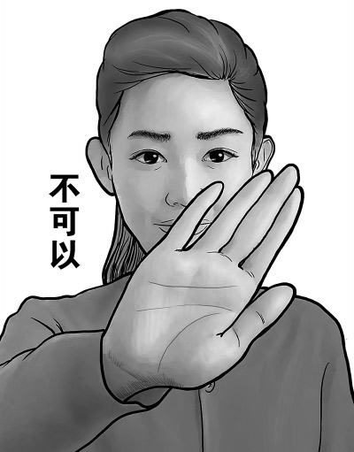 | The photo shows the 3rd gesture: hold a hand up to the smoker to signal "smoking is not allowed in here." (Photo/Jinghua Times) |