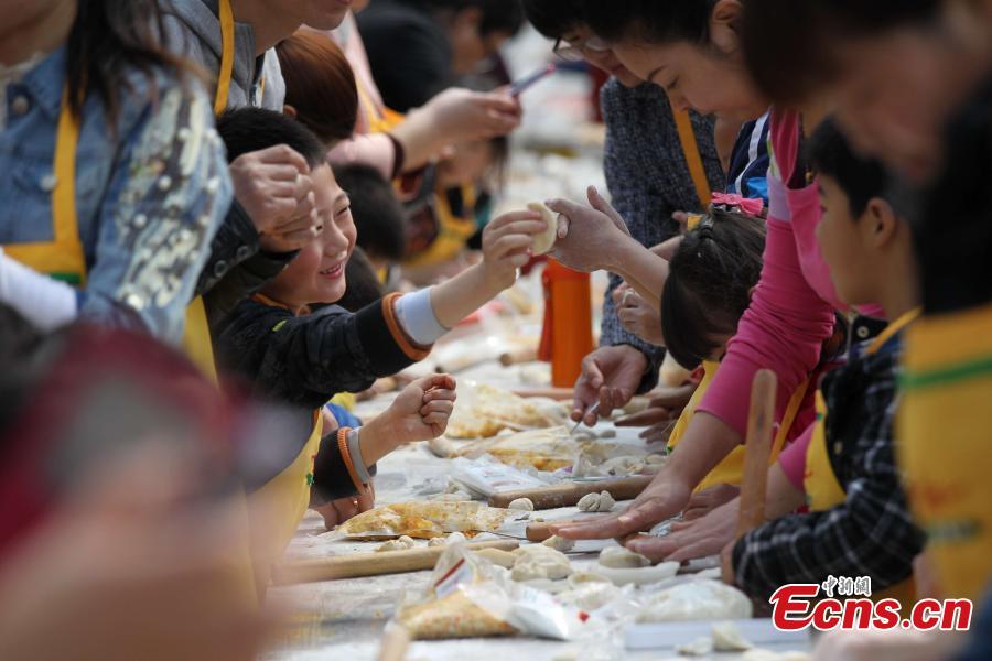 A total of 17,000 people simultaneously make dumplings while watching a cooking class video in 18 places in North China’s Henan province, April 12, 2015. With 4613 participants passing the challenge in the 50-minute long class, it set a Guinness World Record for the largest cooking class. The previous record involved 3,687 people making dumplings in Qingdao, Shandong province, February 14, 2015. (Photo: China News Service/Wang Zhongju)