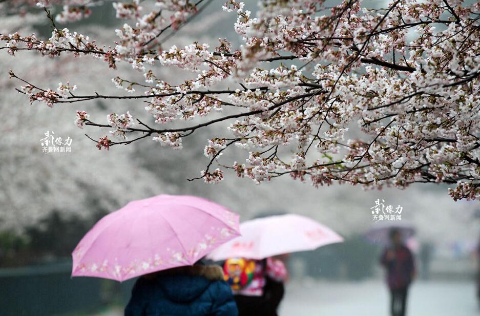 On April 13, people watch the beautiful cherry blossoms at Zhongshan Park in Qingdao City, Shandong province. In the 660-meter-long Cherry Blossom Street, they enjoyed the peak bloom and took photos of the amazing scenery in the moist airafter the rain. (Photo source: iqilu.com)