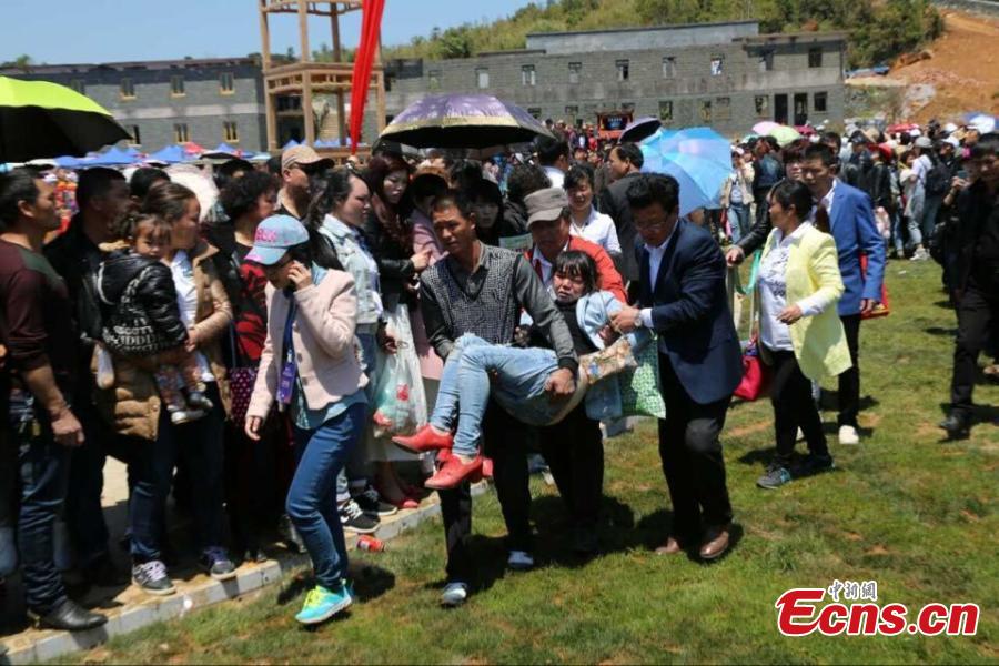 | An injured woman is sent to the hospital after a climbing facility collapse killed two people at a tourist site in east China's Zhejiang province. (Photo: China News Service/Wang Jianping) |