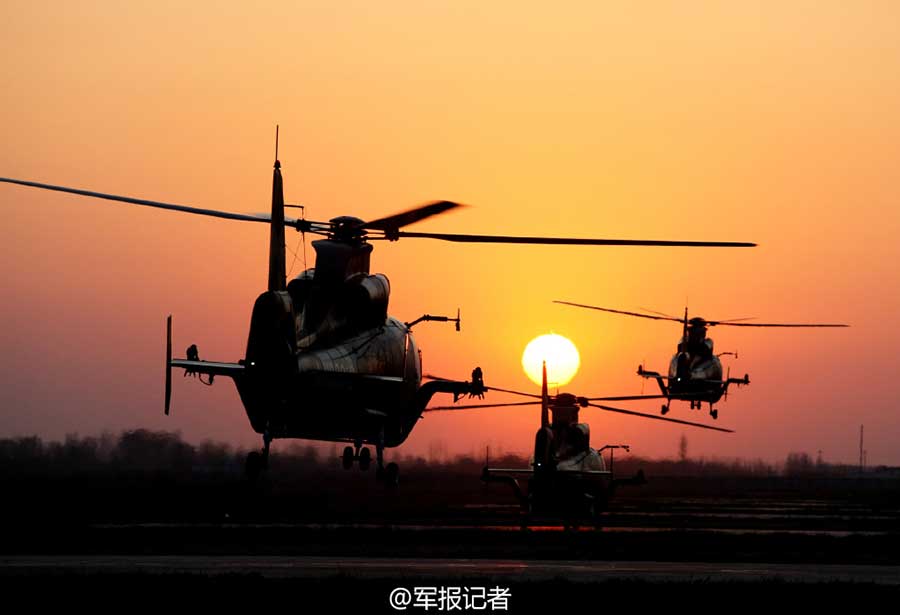 On April 10, 2015, an aviation brigade under the Lanzhou Military Region of the People's Liberation Army conducted flight training day and night to temper all-weather combat capability. (81.cn/Photo)