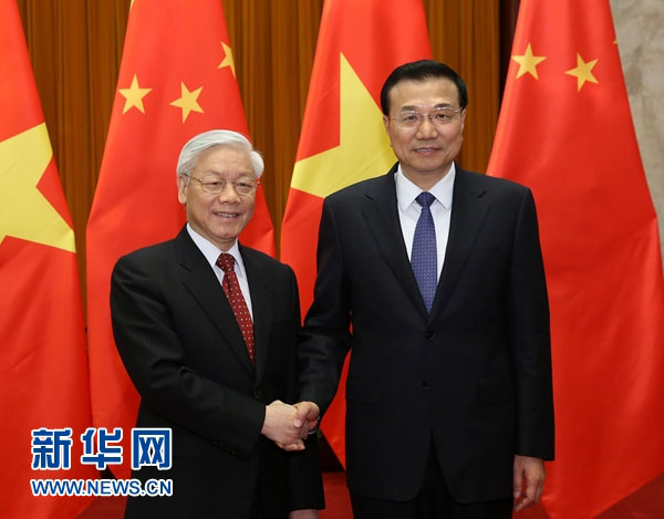 | Chinese Premier Li Keqiang (R) meets with the General Secretary of the Communist Party of Vietnam, Nguyen Phu Trong, at the Great Hall of the People in Beijing, on April 8, 2015. [Photo:Xinhua] |