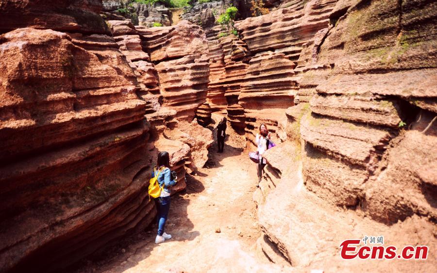 A view of Karst landform composed of red mudstone, valleys, and cliffs in Youyang county, Southwest China’s Chongqing municipality. The area is under development to become a tourist attraction. (Photo: China News Service/Chen Bisheng)