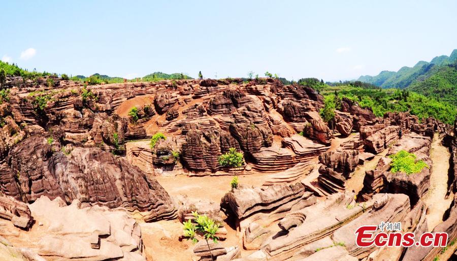 A view of Karst landform composed of red mudstone, valleys, and cliffs in Youyang county, Southwest China’s Chongqing municipality. The area is under development to become a tourist attraction. (Photo: China News Service/Chen Bisheng)