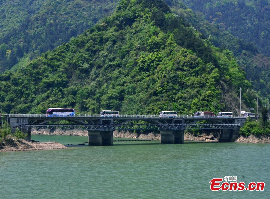 A larger coach decorated with ribbons and Chinese character Xi (meaning happiness) leads a convoy of coaches for wedding cerebration at a valley in Enshi, Central China’s Hunan province, April 15, 2015. Groom He Yi, 34, runs a travel agency and his bride Song Can is a guide, so the couple organized the procession to pass through the valley, which they say has witnessed their love, as part of their wedding celebration. (Photo: China News Service/Song Dandan)