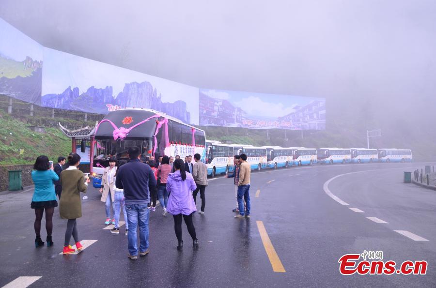 A larger coach decorated with ribbons and Chinese character Xi (meaning happiness) leads a convoy of coaches for wedding cerebration at a valley in Enshi, Central China’s Hunan province, April 15, 2015. Groom He Yi, 34, runs a travel agency and his bride Song Can is a guide, so the couple organized the procession to pass through the valley, which they say has witnessed their love, as part of their wedding celebration. (Photo: China News Service/Song Dandan)