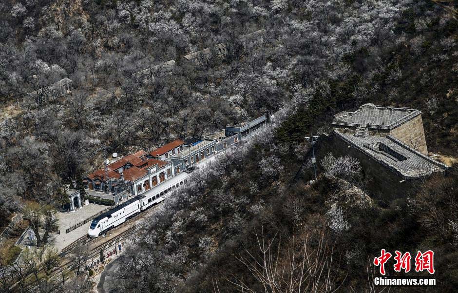 A train passes through the sea of flowers at Qinglongqiao Station on April 10, 2015. (Chinanews/Zhang Hao)