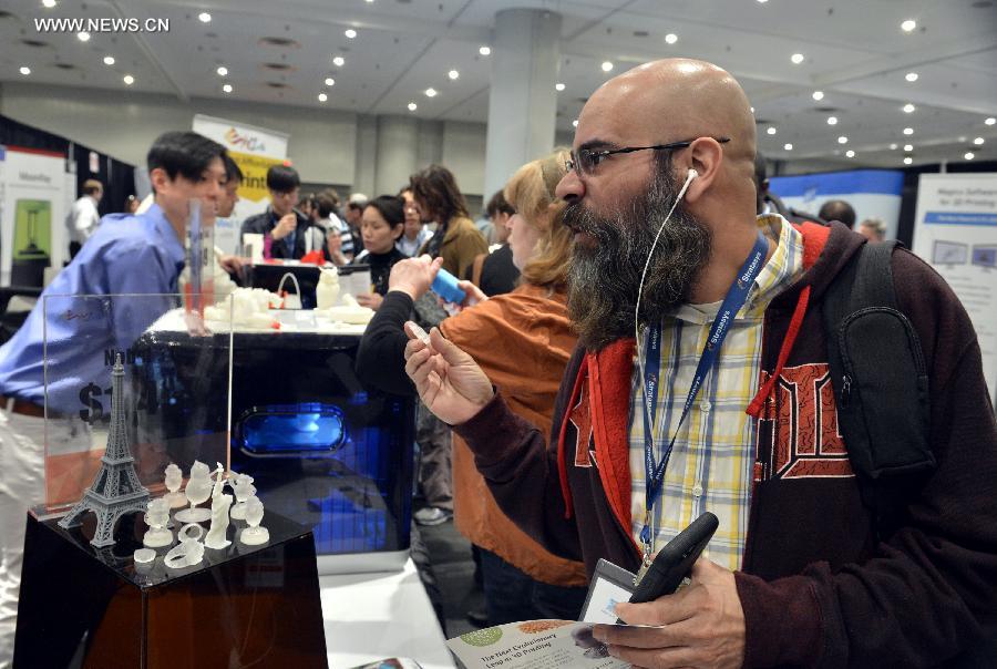 People look at the 3D printed products at the 3D Print Design Show in New York, the United States, April 16, 2015. The 3D Print Design Show is held on April 16 and 17 in New York. (Xinhua/Wang Lei)