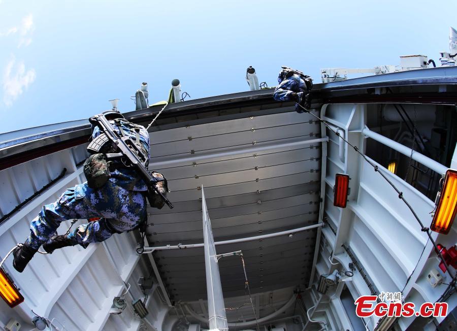 Soldiers of the 20th fleet from China's navy train while sailing to the Gulf of Aden and waters off Somali to escort civil ships, April 16, 2015. The fleet is comprised of the missile destroyer Jinan, missile frigate Yiyang and supply ship Qiandaohu. It is equipped with two helicopters and staffed by dozens of special operation soldiers and more than 800 officers and soldiers. (Photo: China News Service/Dai Zongfeng)