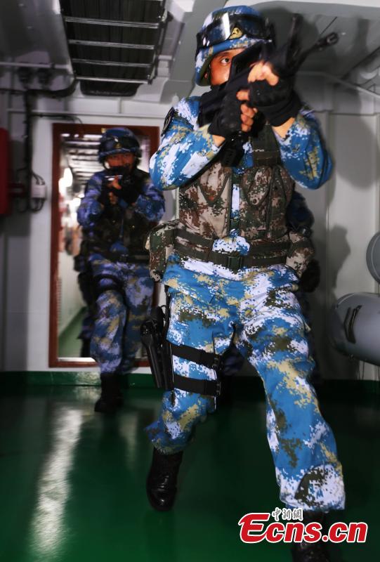 Soldiers of the 20th fleet from China's navy train while sailing to the Gulf of Aden and waters off Somali to escort civil ships, April 16, 2015. The fleet is comprised of the missile destroyer Jinan, missile frigate Yiyang and supply ship Qiandaohu. It is equipped with two helicopters and staffed by dozens of special operation soldiers and more than 800 officers and soldiers. (Photo: China News Service/Dai Zongfeng)