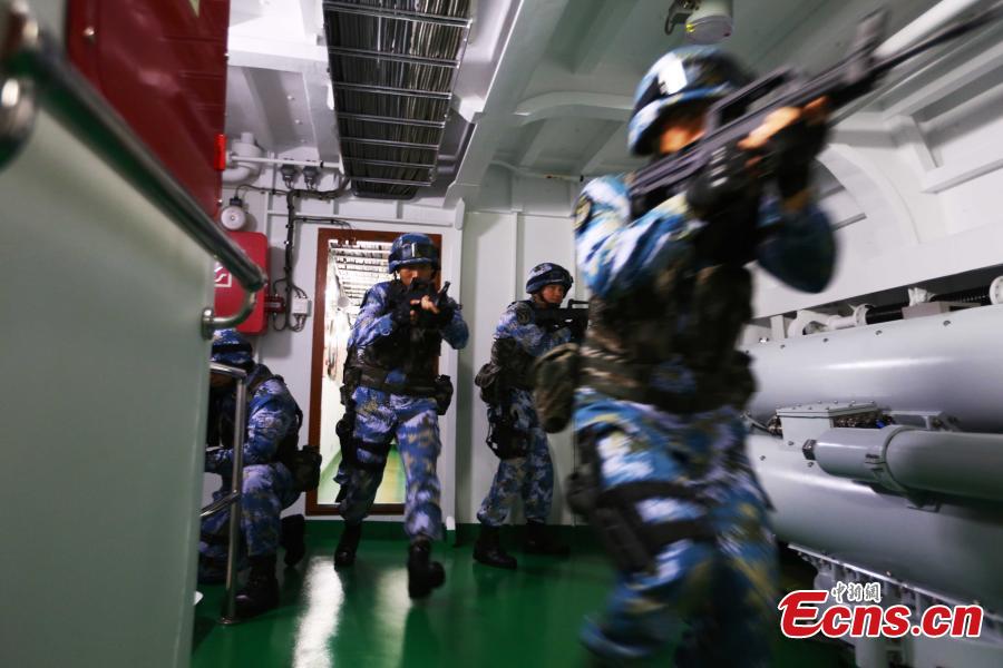 Soldiers of the 20th fleet from China's navy train while sailing to the Gulf of Aden and waters off Somali to escort civil ships, April 16, 2015. The fleet is comprised of the missile destroyer Jinan, missile frigate Yiyang and supply ship Qiandaohu. It is equipped with two helicopters and staffed by dozens of special operation soldiers and more than 800 officers and soldiers. (Photo: China News Service/Dai Zongfeng)