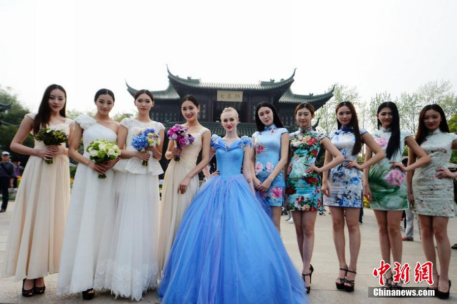 Models from home and abroad take part in the opening ceremony of Flowery March International Economic, Trade and Tourism Festival in Yangzhou, east China's Jiangsu Province, April 18, 2015. (Photo source:chinanews.com)