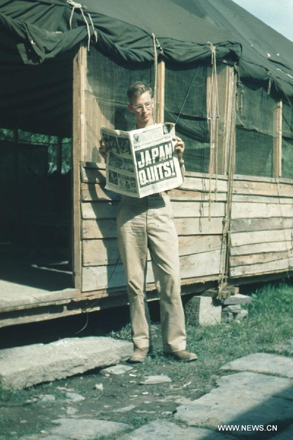 The file photos taken in August, 1945 shows U.S. veteran Joe Day reading English newspaper reporting on Japan's surrender in Zhijiang County, central China's Hunan Province. A museum in Zhijiang Dong Autonomous County of Hunan Province debuted 32 color photos on April 17, 2015 that documented Japan's surrender in the province in August 1945. They were among 223 photos of the Chinese Anti-Japanese War donated last November by Joe Day, a member of the Flying Tigers, the 1st American Volunteer Group formed in 1941 to help China drive out invading Japanese troops. On August 21-23, 1945, Japanese representatives fled to Zhijiang, handed over a map of Japanese troops deployed in China and signed a surrender memorandum. (Xinhua)