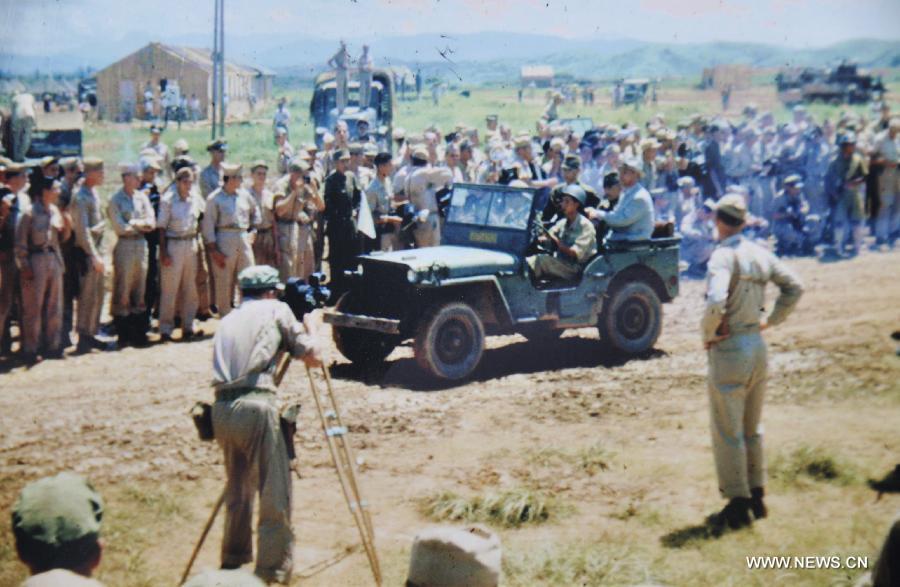 The copied file photo taken on August 21, 1945 by U.S. veteran Joe Day shows the Japanese representatives in a car with white flag on their way to surrender in Zhijiang County, central China's Hunan Province. A museum in Zhijiang Dong Autonomous County of Hunan Province debuted 32 color photos on April 17, 2015 that documented Japan's surrender in the province in August 1945. They were among 223 photos of the Chinese Anti-Japanese War donated last November by Joe Day, a member of the Flying Tigers, the 1st American Volunteer Group formed in 1941 to help China drive out invading Japanese troops. On August 21-23, 1945, Japanese representatives fled to Zhijiang, handed over a map of Japanese troops deployed in China and signed a surrender memorandum. (Xinhua/Ming Xing)