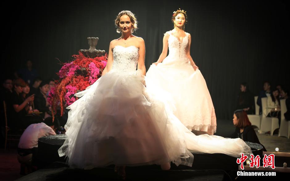 Models dressed in trendy wedding dresses perform a spectacular wedding show in a hotel in Nanjing. (Chinanews/Yang Bo)