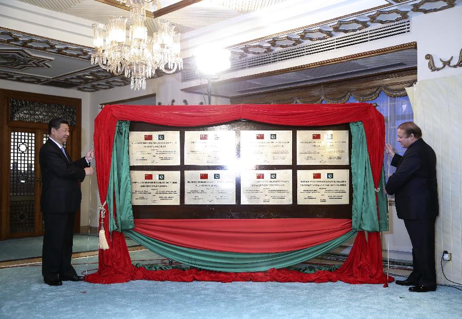 Visiting Chinese President Xi Jinping (L) and Pakistani Prime Minister Nawaz Sharif attend an inauguration for cooperative projects between the two sides after their talks in Islamabad, capital of Pakistan, April 20, 2015. (Xinhua/Lan Hongguang)