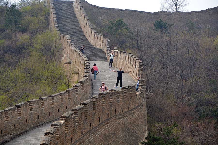 People take photos when they climb the Huanghuacheng Water Great Wall. (People's Daily Online/Wang Ao)