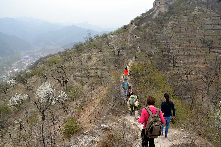 | People take photos when they climb the Huanghuacheng Water Great Wall. (People's Daily Online/Wang Ao) |