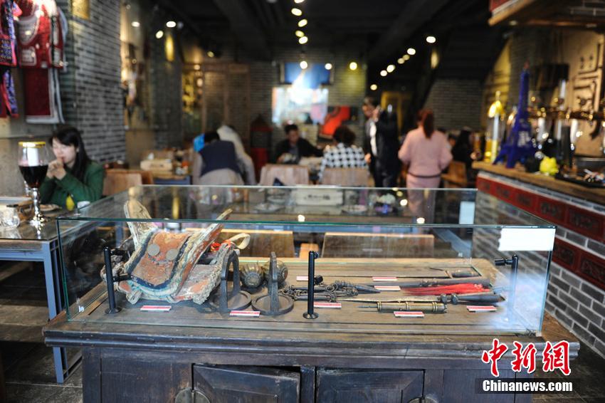 A museum-themed restaurant opens in Changchun, capital of northeast China's Jilin province, April 18, 2015. The restaurant exhibits clothes and handicrafts with features of northeast Chinese history. (CNS/Zhang Yao)