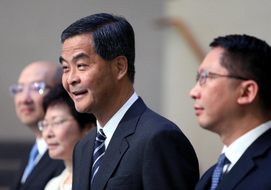 Hong Kong Chief Executive Leung Chun-ying answers questions during a press conference in Hong Kong, south China, April 22, 2015. Hong Kong government on Wednesday revealed a constitutional reform package designed for election of the Special Administrative Region(SAR)'s next top leader by universal suffrage in 2017. Leung said earlier on Wednesday that "today is an important milestone for Hong Kong's democratic development". (Xinhua/He Jingjia)