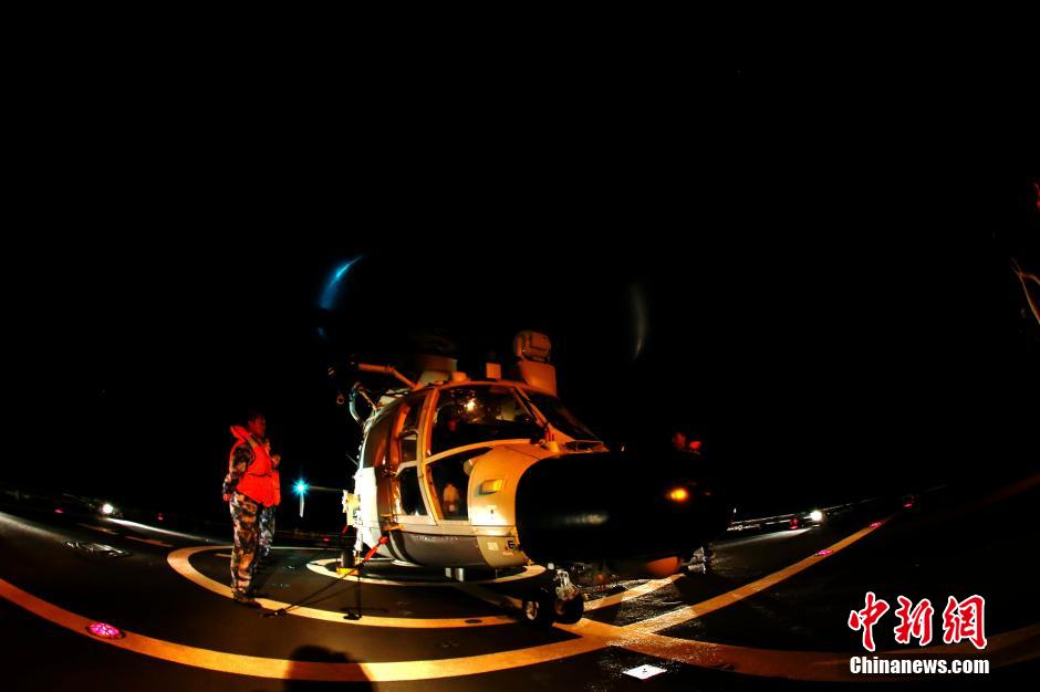 The 20th escort fleet of Chinese navy in the Gulf of Aden and waters off Somali conducted flight training for ship board helicopters on April 19, 2015. Two helicopters on missile destroyer Jinan and missile frigate Yiyang successfully finished this day and night training, with multiple training subjects completed. (Chinanews/Dai Zongfeng)