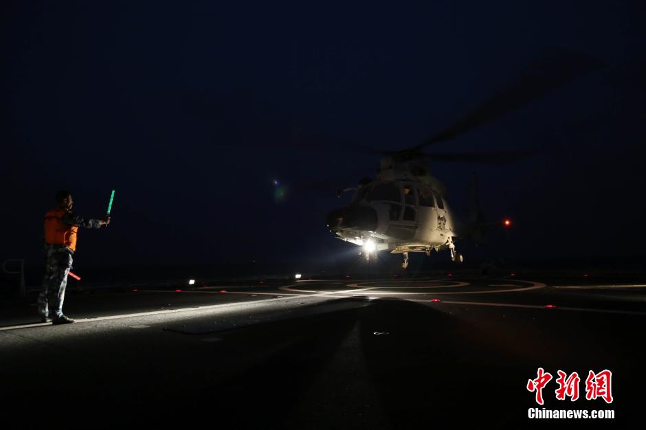 The 20th escort fleet of Chinese navy in the Gulf of Aden and waters off Somali conducted flight training for ship board helicopters on April 19, 2015. Two helicopters on missile destroyer Jinan and missile frigate Yiyang successfully finished this day and night training, with multiple training subjects completed. (Chinanews/Dai Zongfeng)
