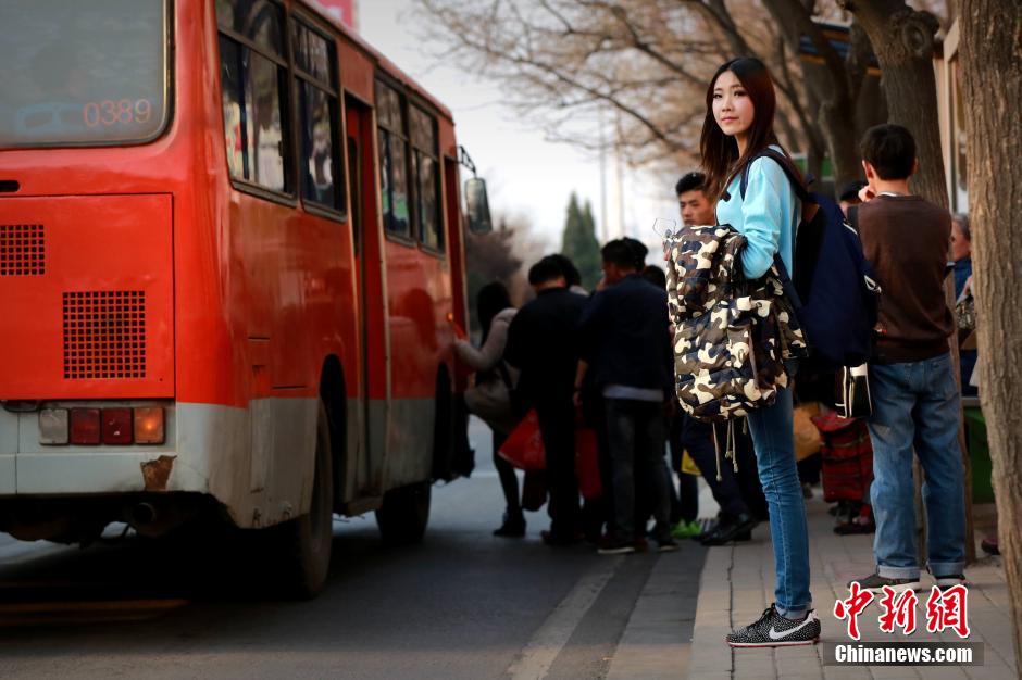 Chen is quite tired after working as a model at the car show all day. It takes her more than an hour to get back to the university.(Chinanews.com/Liang Ben)