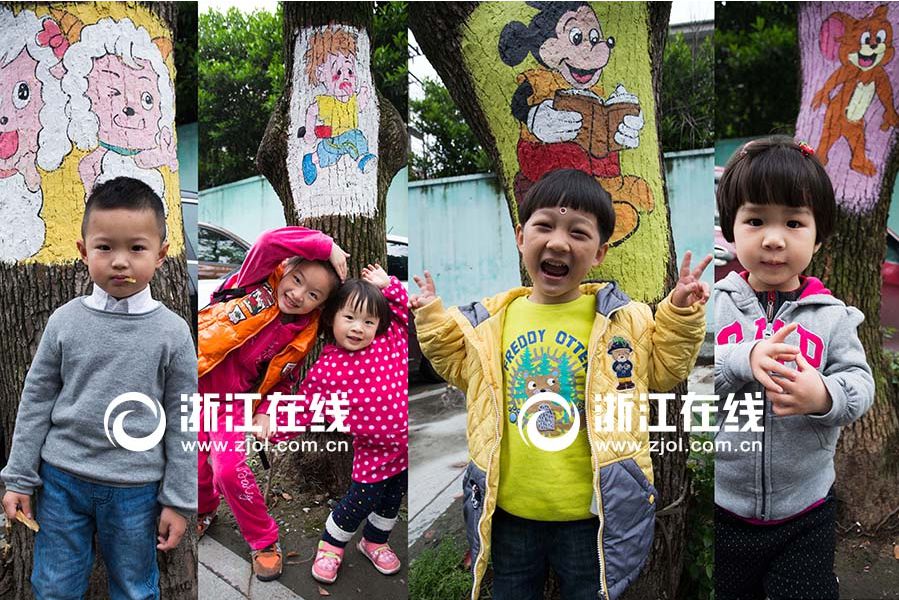 Kids pose with the trees. (Zhejiang Online/Tong Xiaolei)