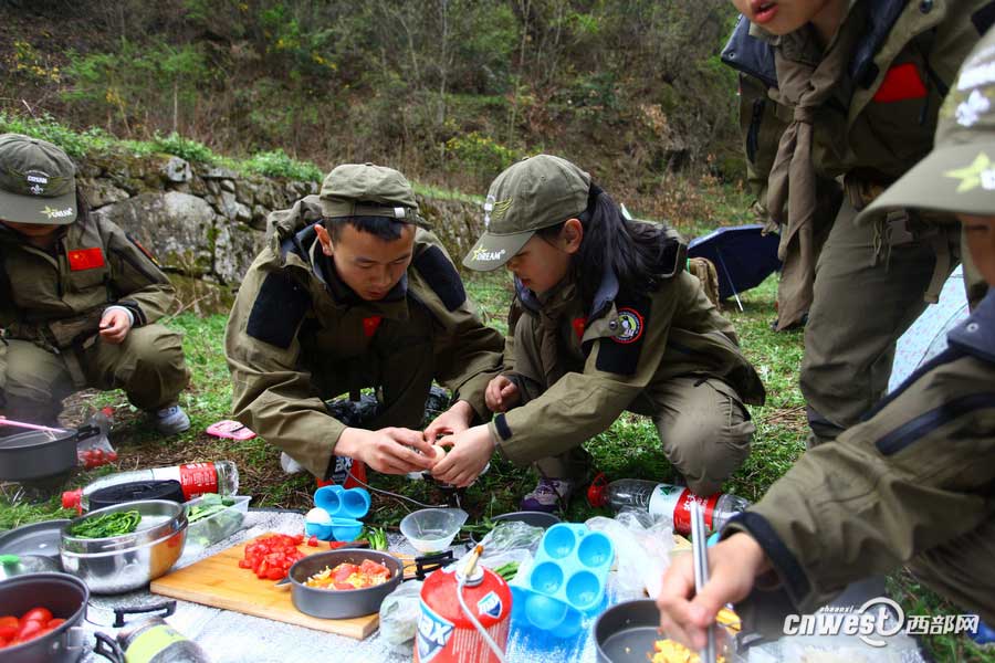 More than 20 primary school students learn outdoor skills including outdoor cooking and experience their lives in the wild in Yingpan Township, Shangluo, northwest China's Shaanxi Province on April 18, 2015. (Photo/cnwest.com)